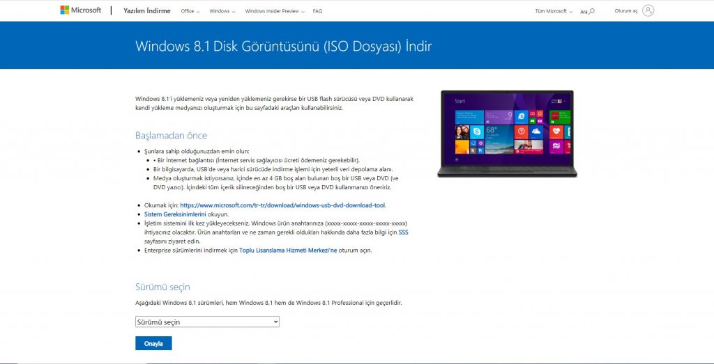 İlk önce https://www.microsoft.com/tr-tr/software-download/windows8ISO sitesine gidip indirilecek sürümü seçiyoruz.
